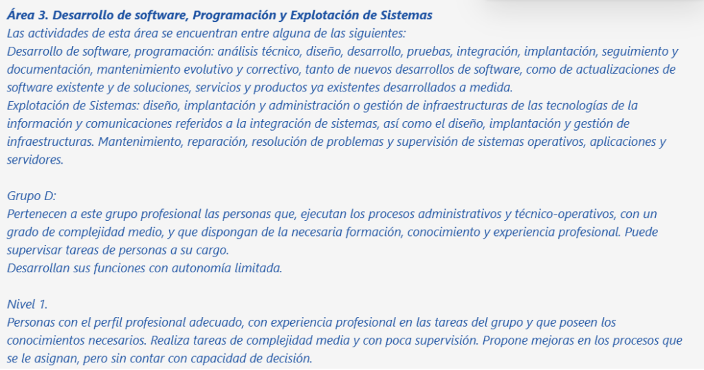RRHH en la reunión de TSO comunicó que no iba a ver grandes cambios en cuanto a la categoría profesional de los trabajadores. Actualmente estamos la gran mayoría englobados en área 3, Grupo D Nivel 1, y una minoría en Grupo B y E.