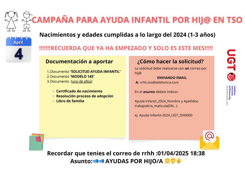 Buenos dÃas compañeras y compañeros, os recordamos que tenemos el plazo abierto para solicitar la ayuda infantil , que no se os pase la fecha!